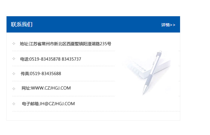 地址:常州市新北區友邦商務大廈1幢16、17層  電話:0519-85101652  傳真:0519-85112595  郵編:213022  網址:www.cz-jiayue_cn.bjcooc.com  郵箱:xiajifengaa@163.com